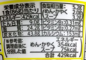 カロリー:429kcal(めん・かやく354 kcal 、スープ75 kcal)